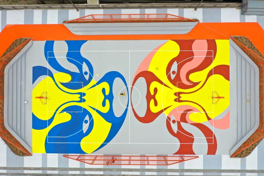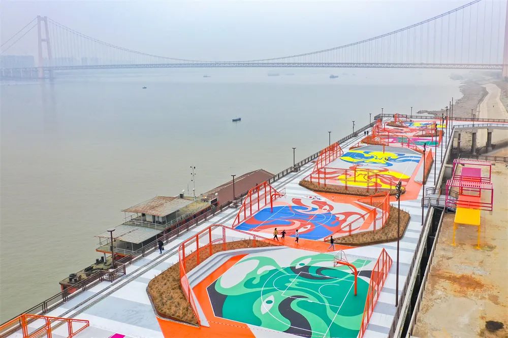 ? ? ? ?除了對原有碼頭元素創(chuàng)新改造,高樁平臺上的活動區(qū)域也亮點紛呈:平臺兩端都建設(shè)了約兩米寬的玻璃棧道,站在上面,低頭就可以看見滾滾奔流的長江水;面向江心左邊,是全國唯一的國風(fēng)籃球場,從空中俯瞰,精致的京劇臉譜整齊排列在球場內(nèi),為岸線添上一抹色彩。正是通過這種漸進(jìn)式改造,讓更多城市歷史文化記憶在江灘活起來、傳下去。