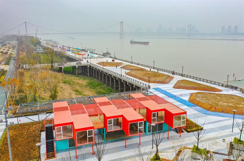? ? ? ?拆除多余碼頭裝置,恢復(fù)江灘原貌,替老碼頭“卸妝”。對碼頭原有19座閘口進(jìn)行了集并,變成了一主一次兩座閘口,大幅提升了通達(dá)感;采用現(xiàn)代防洪技術(shù)與理念,以“生態(tài)緩坡堤防+拼裝式防洪墻”的設(shè)計,讓堤壩“隱身”,弱化了“江、灘、堤、城”之間的界限,使原本獨立的景觀相互融合,又豐富了寶貴的公共空間。
